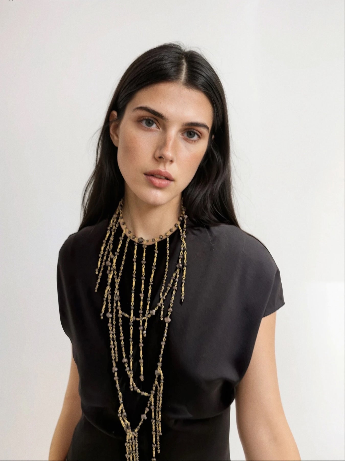 Collar largo de cuentas con diseño asimétrico. Perfecto para darle un toque especial a cualquier look.