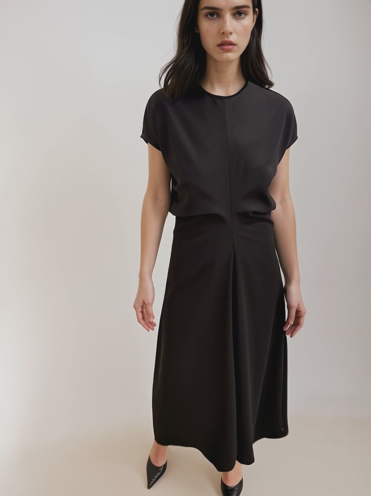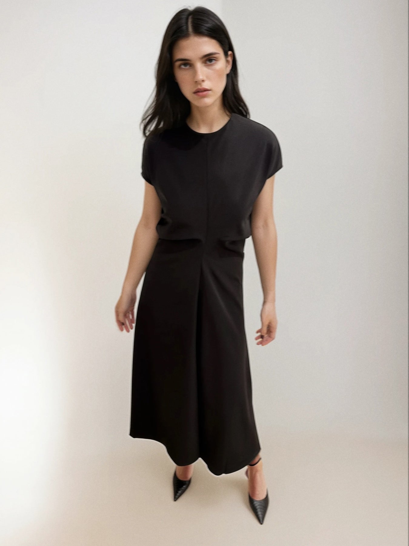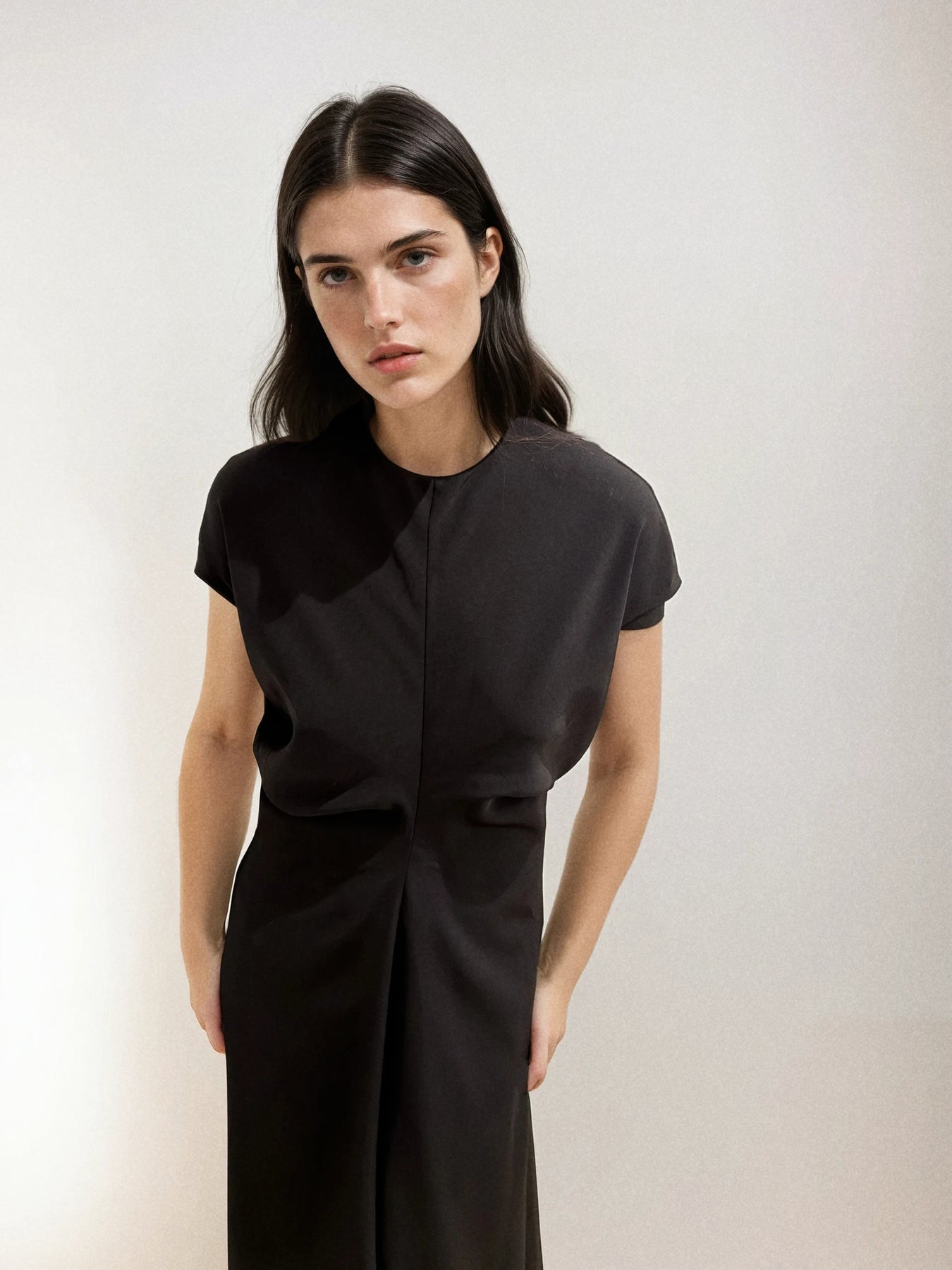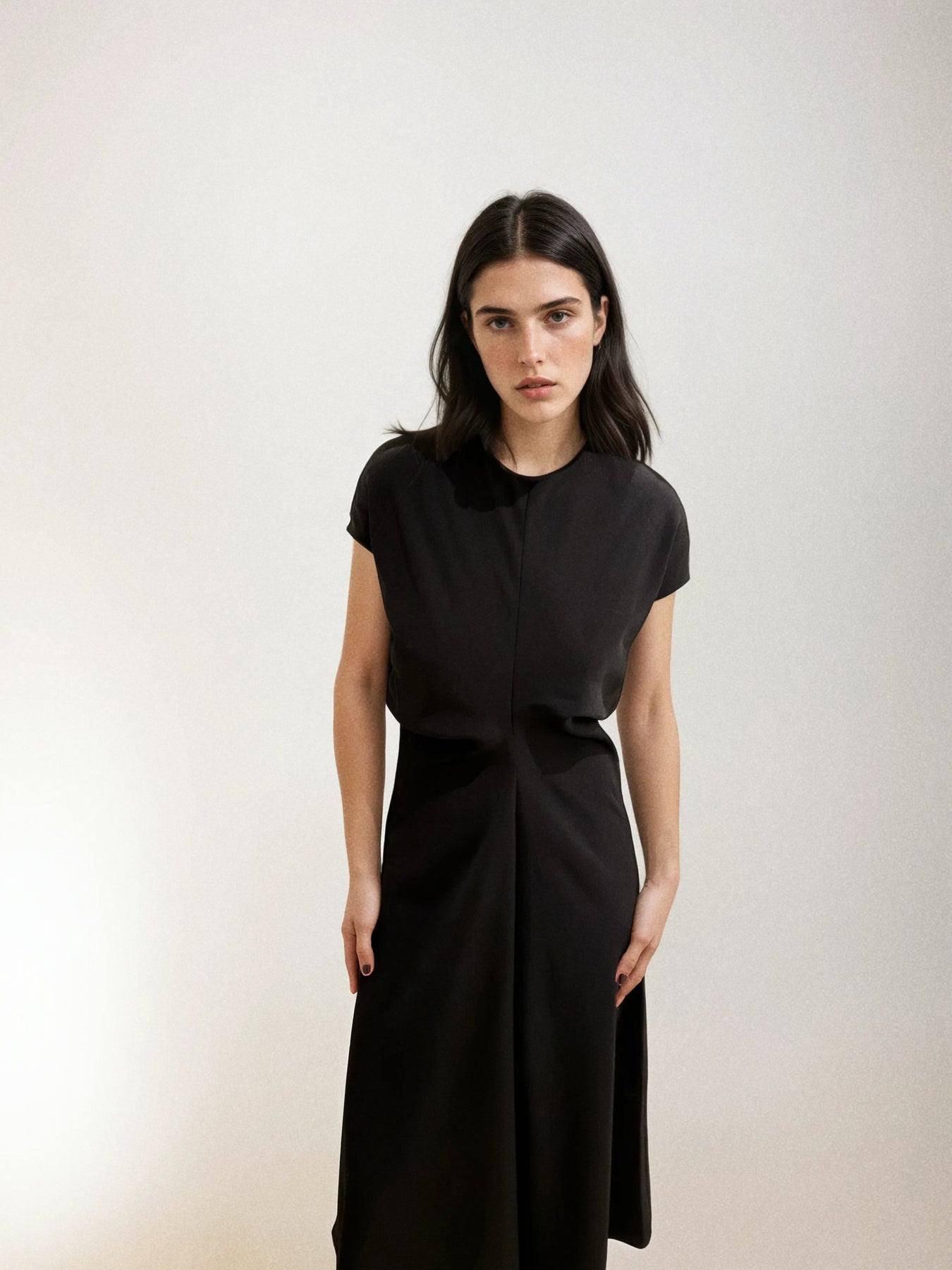 Vestido midi en negro ajustado en la cintura que define la silueta de manera elegante. Confeccionado en tejido de calidad, este diseño es un básico en cualquier armario.